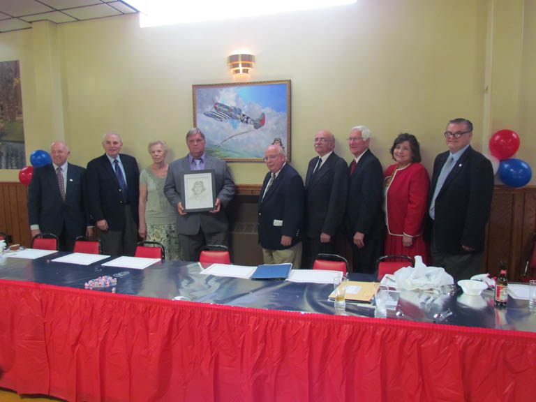 After the ceremony the attendees retired to the nearby PNA Hall Lodge 905 for a banquet. Here it was possible to view some Francis Gabreski memorabilia that has been preserved by the Lodge as well as a wall sized painting of Col. Gabreski and his P-47 "Thunderbolt" fighter engaged in air combat with an Me-109 Messerschmidt. A modified version of this painting was used on the cover of the commemorative program book. At the banquet's conclusion Mr. Janusz Romanski presented certificates of appreciation from the Polonia Technica Polish Engineers' Association. All went home happy to have been present at this exceptionally well organized ceremony. Guests from as far away as Philadelphia and Chicago were able to take with them an expertly designed souvenir program which, in addition to historical information, listed the many sponsors who financed or otherwise supported the event.