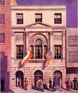 The Kosciuszko Foundation House, cited in the American Institute of Architects Guide to New York City, offers an elegant home for the Foundation�s numerous activities. It was originally built in 1917 as a private residence for James J. Van Allen, a prominent socialite and son-in-law of Mrs. Astor. (Mrs. Astor�s own double mansion was next door, occupying an entire block of Fifth Avenue, on the site of the present Temple Emanu-el.) A four-story structure combining Renaissance style and Classical architecture, it was designed by Harry Allen Jacobs, who also supervised the renovation and joining of the buildings facing it on 65th Street. It is remarkable in its appropriateness both as a headquarters of a prestigious national institution and a repository of fine art. It was based on a London townhouse, built in 1772 in St. James Square for Sir Watkins Williams Wynn; until 1920, this London house belonged to the Earl of Strathmore, the father of the present Queen Mother of England.