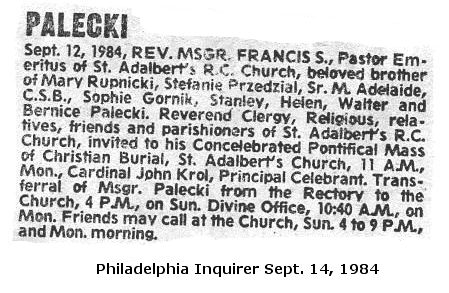Monsignior Palecki died September 12, 1984, at the Atlantic City Medical Center,