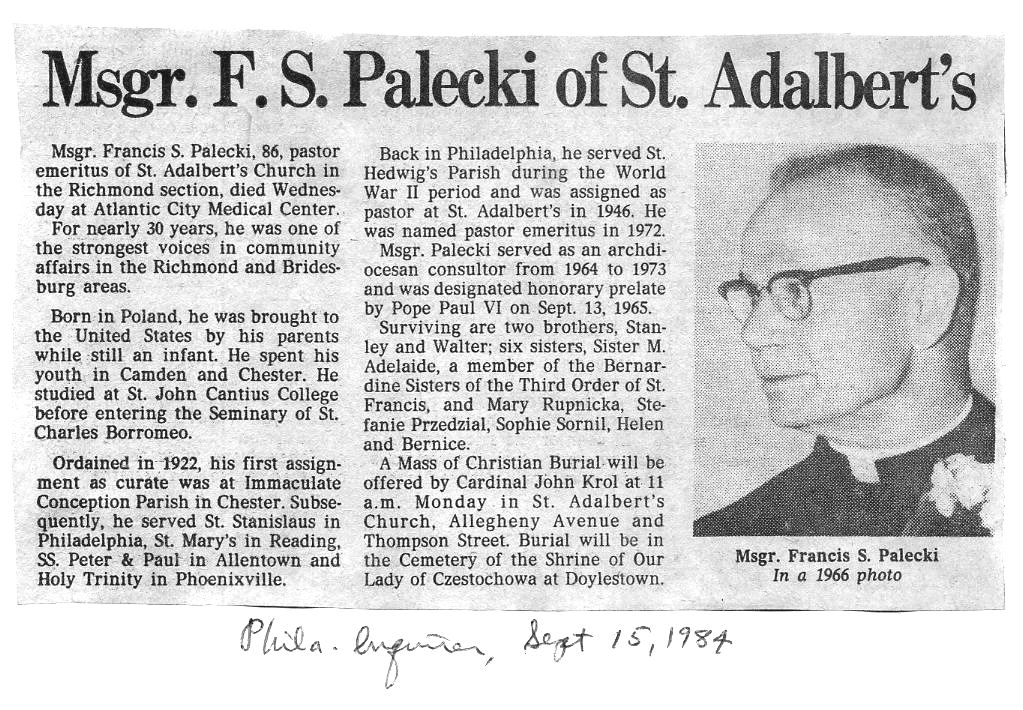 Msgr. F.S. Palecki of St. Adalbert's -- obituary articleMsgr. Francis S. Palecki, 86, pastor emeritus of St. Adalbert's Church in the Richmond section, died Wednesday at Atlantic City Medical Center. For nearly 30 years, he was one of the strongest voices in community affairs in the Richmond and Bridesburg areas.