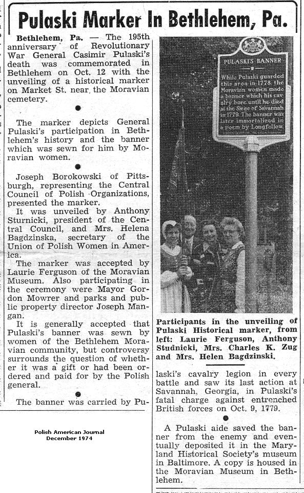 [button] Article Pulaski's Marker in Bethlehem, Pa Polish American Journal Dec. 1974 Pinkowski Institute Archives