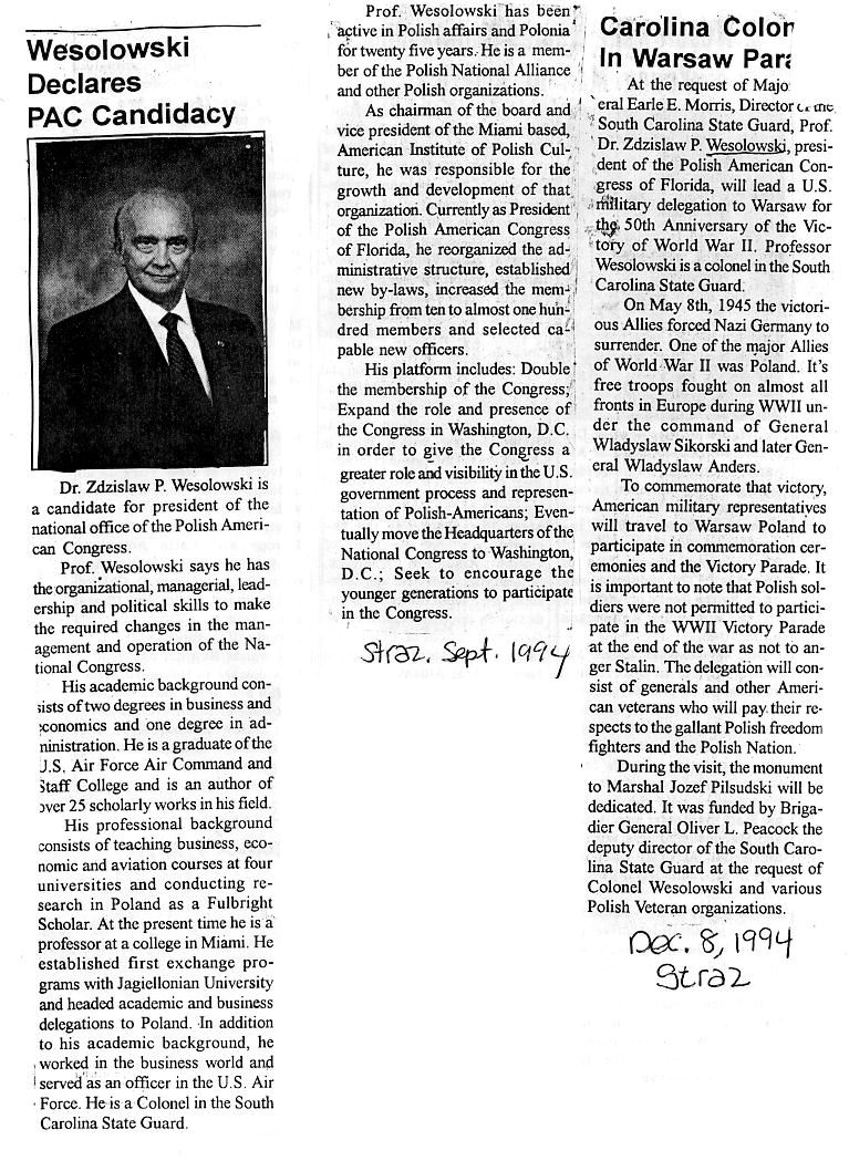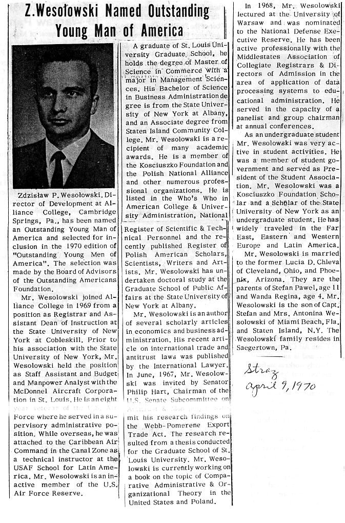 Wesolowski, Zdzislaw PaulBusiness and economics educator, university administrator, retired air force officer; born: Gdynia 1935, Poland; m. Emilia; children: Juliana, Wanda, Stefan. Education: A. A .S., Staten Island Community College. (NY), 1963; B.B.A., SUNY, Albany, 1965; M.B.A., St. Louis U. (MO), 1969; Ph.D., Nova Southeastern U., Ft. Lauderdale (FL), 1977; postdoctoral, Jagiellonian U., Krakow (Poland.), 1978; Air Command and Staff College.; Air Force Aircraft Engineering School